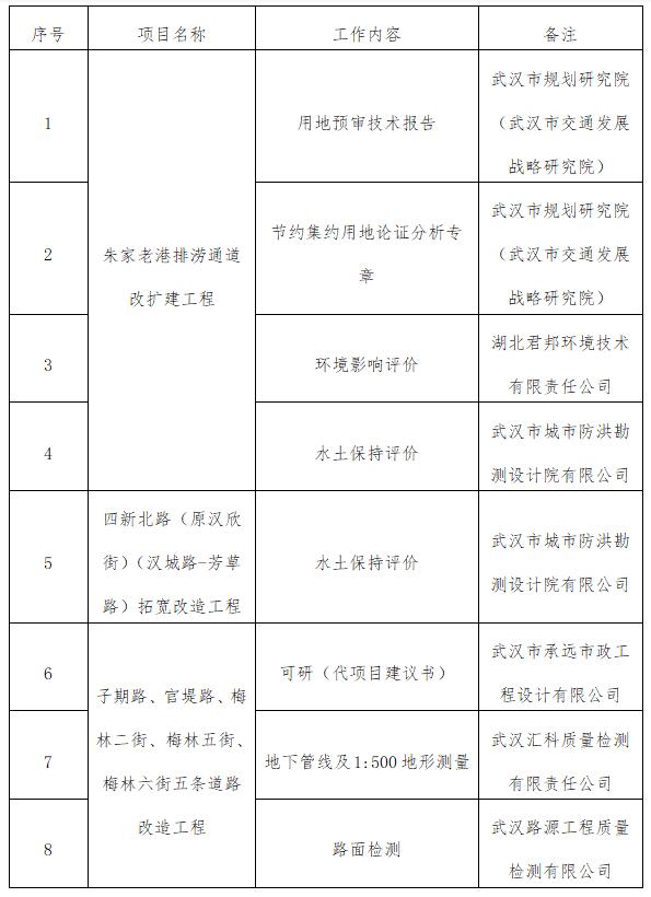 根據《武漢新區建設開發投資有限公司建設項目前期基礎工作社會咨詢單位遴選與管理辦法(修訂)》,新區公司評審小組對朱家老港排澇通道改擴建工程的用地預審技術報告、節約集約用地論證分析專、環境影響評價、水土保持評價、四新北路(原漢欣街)(漢城路-芳草路)拓寬改造工程水土保持評價、子期路、官堤路、梅林二街、梅林五街、梅林六街五條道路改造工程可研(代項目建議書)、地下管線及1:500地形測量、路面檢測等專題進行了評選,其結果詳見附表。