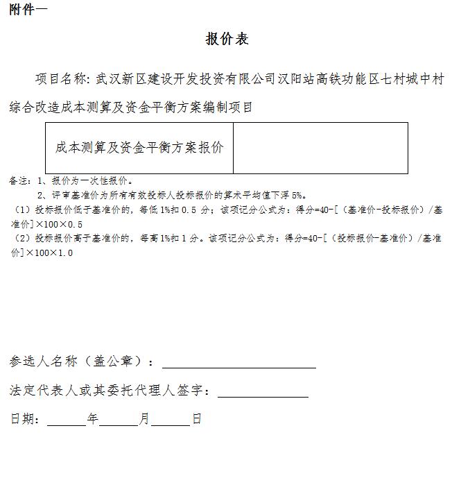 武漢新區(qū)建設(shè)開(kāi)發(fā)投資有限公司正在開(kāi)展?jié)h陽(yáng)站高鐵功能區(qū)七村城中村綜合改造方案編制工作,根據(jù)工作安排,擬對(duì)徐灣、董家店等七村城中村綜合改造成本測(cè)算及資金平衡方案編制單位進(jìn)行遴選。根據(jù)武漢市城市更新工作領(lǐng)導(dǎo)小組辦公室文件《關(guān)于印發(fā)<武漢市城中村綜合改造方案編制與審批流程>的通知》(武城更新組辦(2024)1號(hào))要求,誠(chéng)邀3家及以上具備相應(yīng)資質(zhì)的單位根據(jù)自身業(yè)務(wù)范圍自愿遞交參選文件。詳情如下: