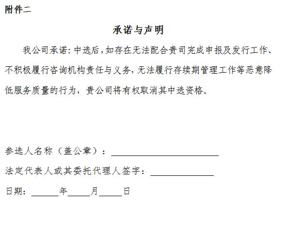 投標(biāo)人應(yīng)在投標(biāo)文件中承諾中選后,如存在無(wú)法配合我司完成申報(bào)及獲批工作、不積極履行責(zé)任與義務(wù),無(wú)法履行存續(xù)期管理工作等惡意降低服務(wù)質(zhì)量的行為,我公司將有權(quán)取消其中選資格。(見(jiàn)附件二)。