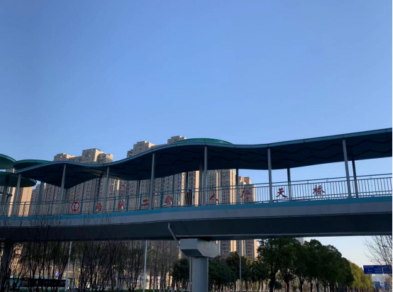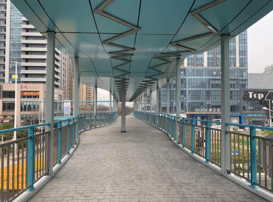 全橋總面積約1026㎡。主橋橋體為淡青色,采用三跨連續鋼箱梁結構,橫跨江城大道。橋面為灰色磚塊樣式,泛著銀色柔光,使用后會形成毛面,防滑美觀。雨棚為波浪造型,活潑大方,形態契合四新片區綠色發展主題。
