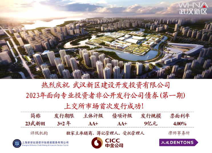 2023年1月6日,新區(qū)公司攻堅克難,在上海證券交易所成功發(fā)行2023年第一期公司債券(23武新01),期限5年(3+2),票面利率4.00%,票面利率創(chuàng)湖北省同期限產(chǎn)品開年新低,實現(xiàn)開門紅。