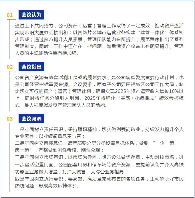 1月2日,新區(qū)公司總經(jīng)理助理何春峰組織召開年度資產(chǎn)(運(yùn)營)管理工作總結(jié)會。運(yùn)營部全面通報(bào)了年度目標(biāo)完成情況、下步工作措施、存在的困難問題及2025年工作計(jì)劃,產(chǎn)投公司及建設(shè)公司匯報(bào)了2024年資產(chǎn)目標(biāo)完成情況及2025年措施計(jì)劃。