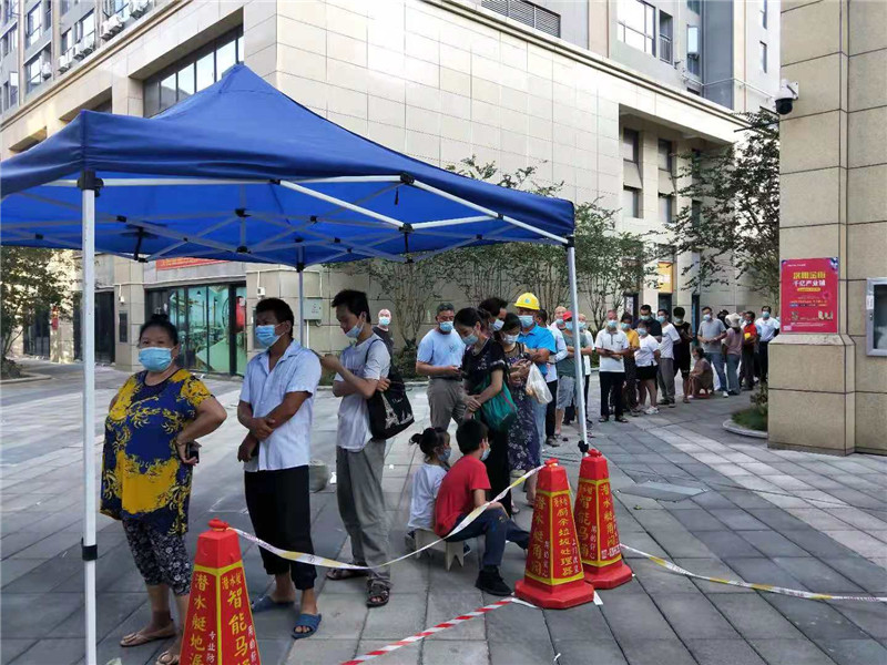 新區公司所屬力旗力冠公司全力支持新陽廣場所屬的芳草社區核酸檢測工作。8月3日,組織物業中心工程部、安保保潔人員,頂著近40度的高溫,迅速完成了新陽廣場核酸監測點的現場布置準備工作,為該檢測點進行帳篷租賃和搭建、空調和照明安裝、檢測通道布置等工作,并組織專人堅守現場進行現場秩序維護。晚上19:30檢測開始,現場待測人員排列井然有序。檢測工作持續到23:00,檢測數量1000余人次。