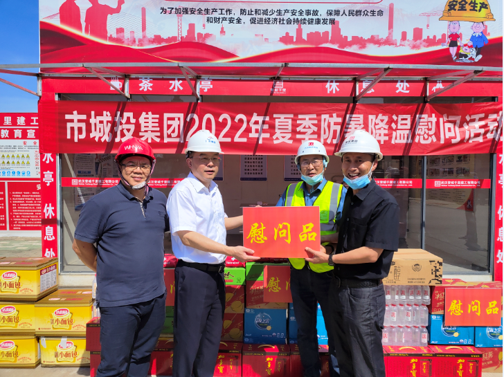 2022年7月12日下午,市城投集團公司黨委委員、董事汪國圣帶領金融部一行到國博公園項目現場進行高溫慰問活動,新區公司總經理方紫微、副總經理王繁陪同參加了此次活動。汪國圣為奮戰在高溫一線的工作人員送去慰問和關懷,并對施工項目現場進行了檢查,提出相關工作要求: 一是進一步加強現場安全文明施工管理,加大施工現場各類安全隱患排查治理力度,提高“三寶、四口、五臨邊”等安全防護意識;加強現場封閉施工和實名制管理,持續開展圍墻、圍擋和工棚安全專項治理工作;二是嚴格落實項目施工現場疫情防控措施,做好登記、測溫、掃碼、消殺等常態化管理;定期組織施工人員進行核酸檢測和對新進場人員進行“落地檢”等防控舉措;三是強化施工現場消防安全管理工作,加強重點部位的安全監管,做好應急預案,嚴格落實責任;切實做好夏季高溫防暑降溫措施,調整施工作業時間,避開高溫天氣,確保施工安全。